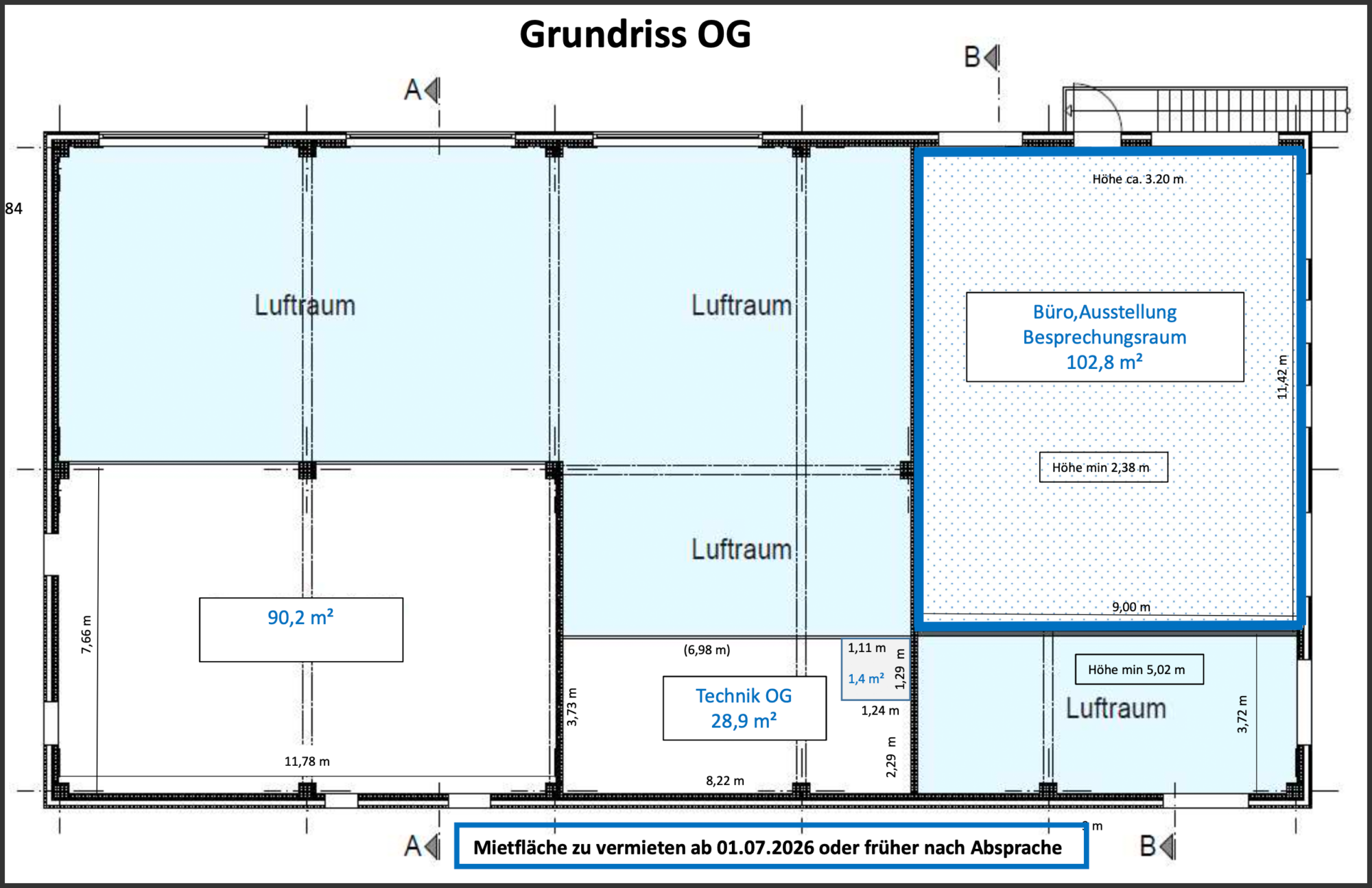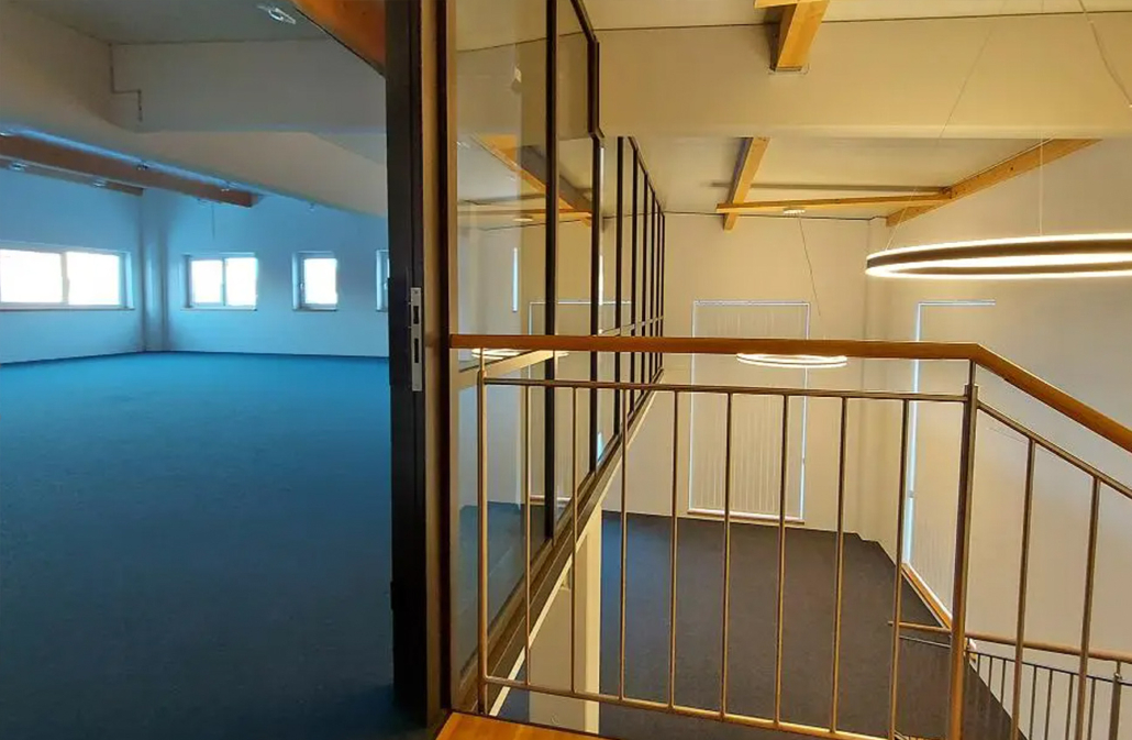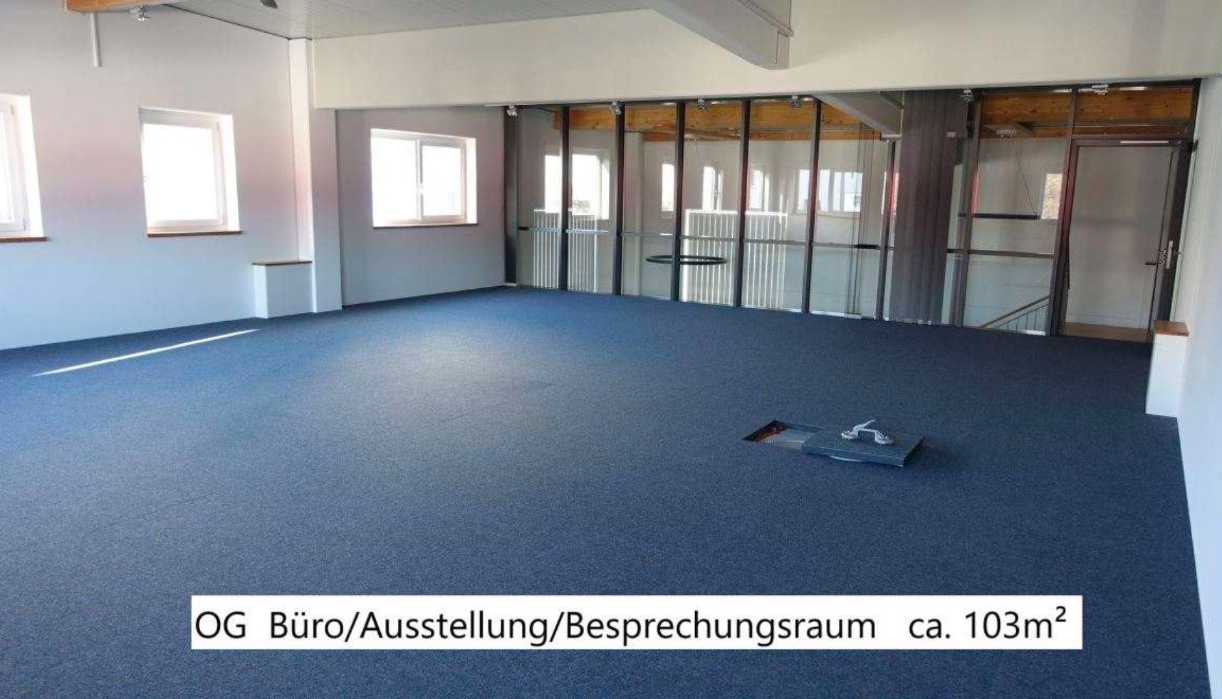 Obergeschoss: 102 m² großzügiger Besprechungsraum, begehbar über eine Außentreppe oder direkt über das Gebäude.