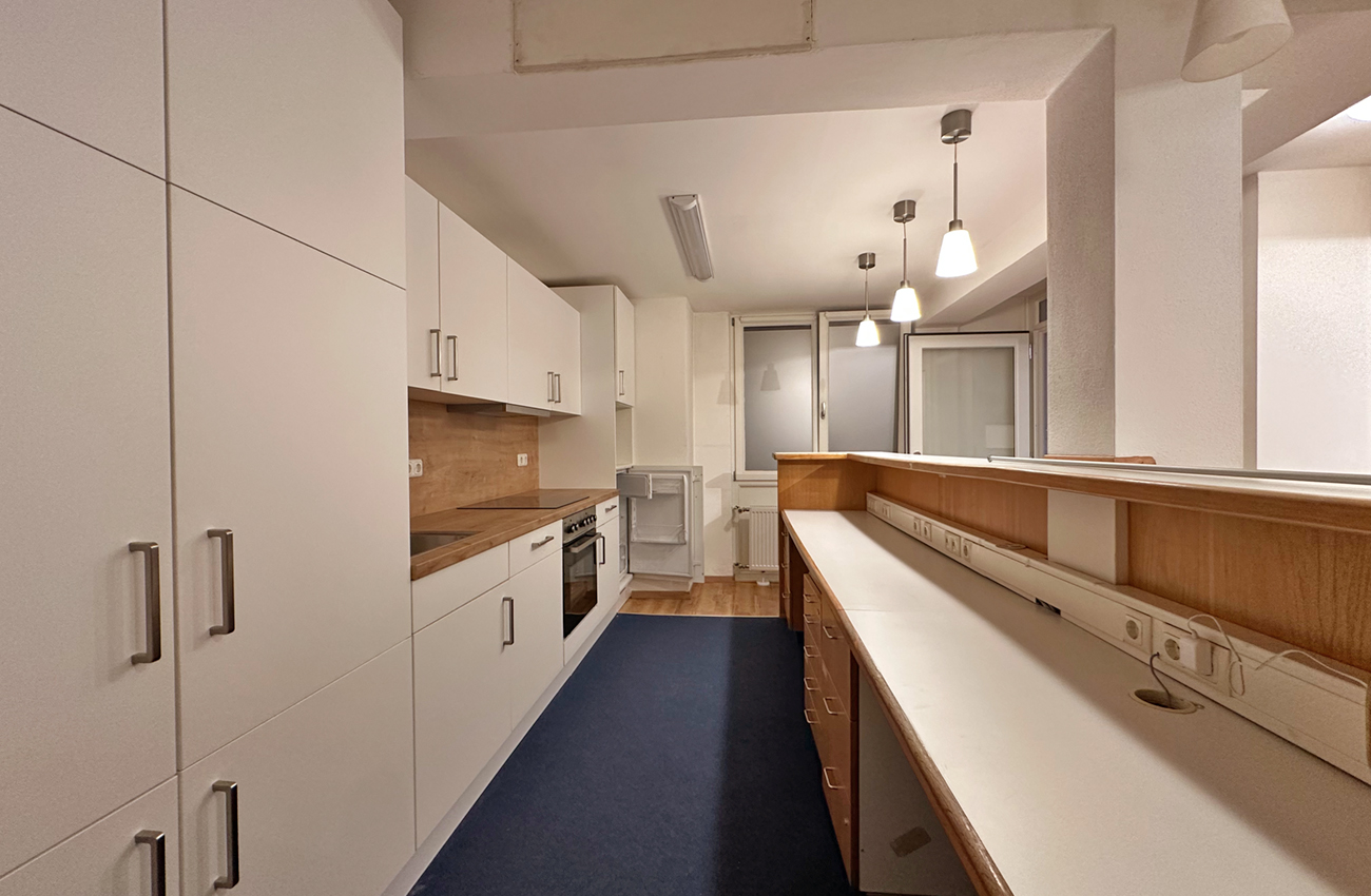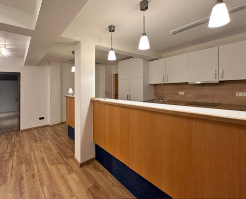 Aufgeteilt ist die Einheit in einen Eingangs/Empfangsbereich mit Einbauküche und Empfangstheke. Die Küche ist mit Elektrogeräten ausgestattet und wird kostenlos zur Verfügung gestellt.